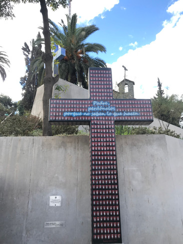 Pegamos o funicular e ele nos levou até uma área com uma vista linda de Santiago. Neste local tem lojinhas e banheiros. Depois fomos andando pela região onde tem uma igreja e mais ao alto um templo com uma vista incrível!